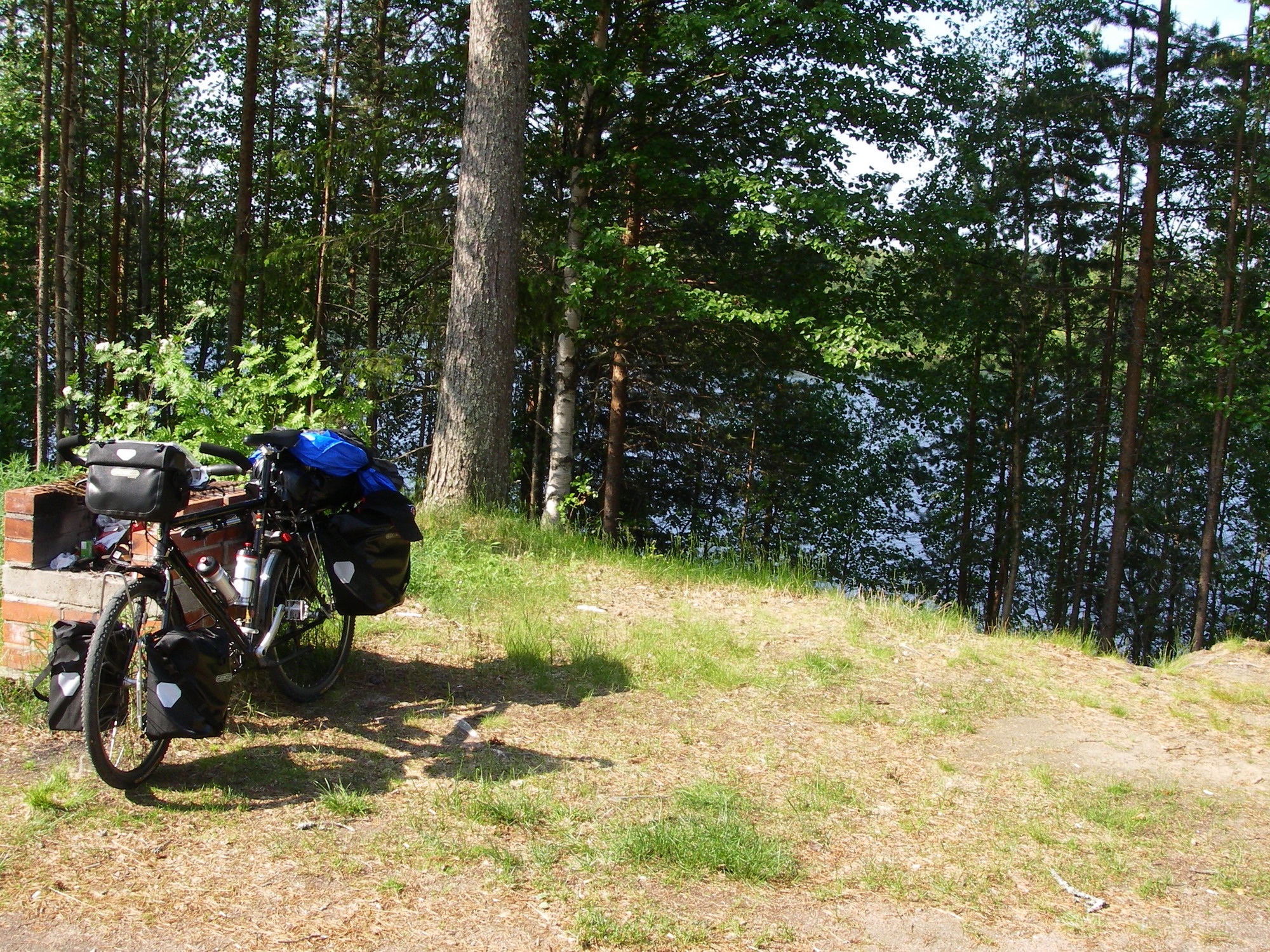 Aamulla heräsin kuovin (lintu) pitämään meteliin. Sillä on pesä jossain vieressä. Kömmin aamutoimille huoltorakennukseen. Kun otin lakin pois päästä sieltä lehahti parvi mäkäriä lentoon. Niitä vastaan ei vaatteet suojaa vaan ne pyrkivät vain kiertämään esteet. Onneksi tuuli alkoi taas nousemaan ja mäkärät ja hyttyset vähenemään. Teltta oli kuivan tuntuinen kovan tuulen ansiosta, joten pakkasin sen heti. Pääsin matkaan seitsämän aikaan aikaan.