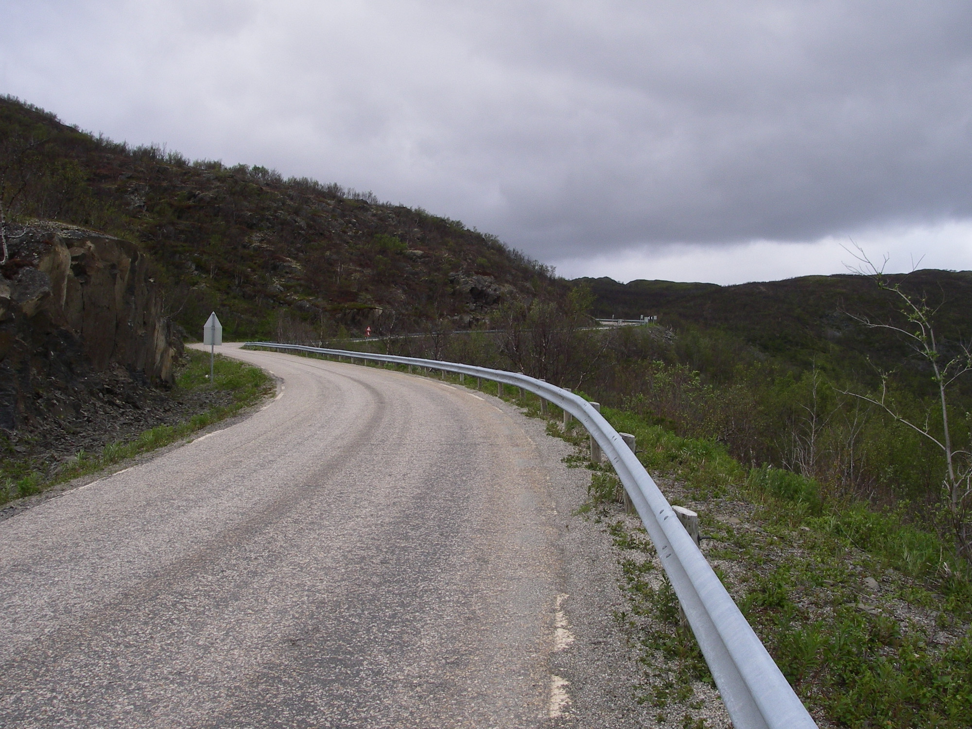 Tie alkoi nousemaan ylös tuntureille. Katselin ihastellen kun se kiemurteli ylös pystysuoraa rinnettä. Otin muutaman kuvan todella jyrkästä mäestä. Sitten se alkoi. Tuuli yltyi niin kovaksi etten pysynyt enää pyörän päällä. Jopa taluttaminen oli välillä vaikeaa. Jouduin monta kertaa kallistamaan pyörää melkein maahan asti koska en jaksanut pitää sitä pystyssä kovassa tuulessa. Välillä kun tuuli oli vastainen pystyin vain nojaamaan tuuleen paikoillani. Talutin pyörää noin 20 km. Aina välillä yritin jatkaa ajamalla mutta tuuli painoi minut aina pois tieltä. Noin 10 km ennen Ifjordia alkoi tuuli laantua.
