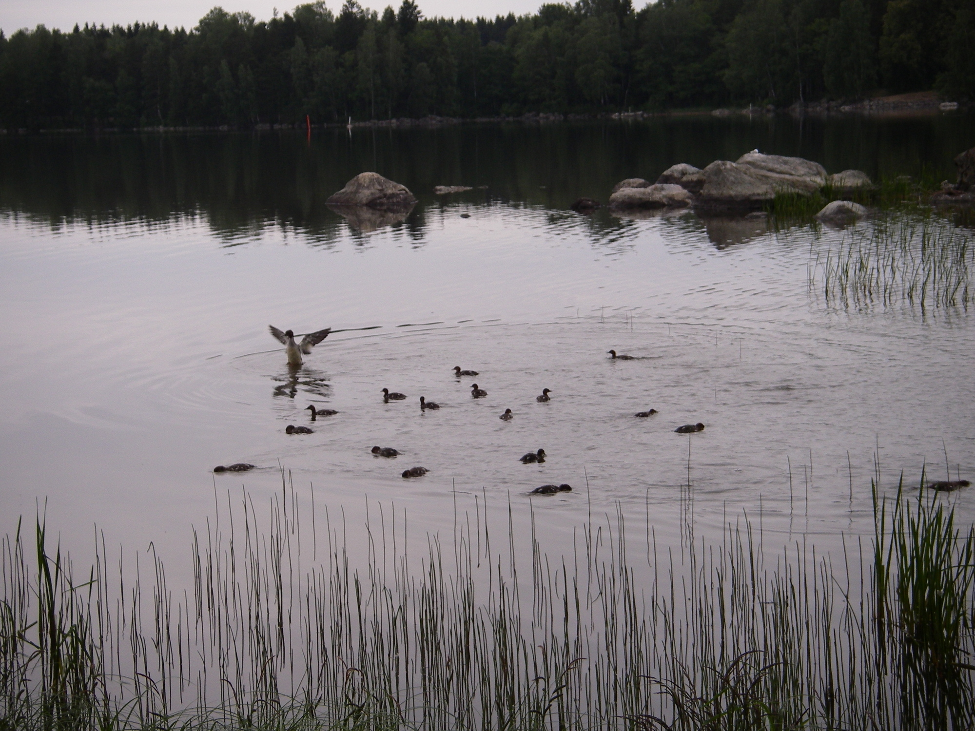 Aamu oli tyyni, taivas oli pilvessä mutta ei satanut. Aloitin tavaroiden pakkaamisen. Välillä piti ottaa kuvia isokoskelo poikueesta. Emo opetti poikasia kalastamaan, siinä kävi kauhea polske kun yli 20 poikasta pulikoi kalojen perässä. Juuri kun aloin pakkaamaan makuupussia alkoi sataa. Tuli kauhea kiire pistää kaikki pakettiin ettei teltta kastuisi kovin pahasti. Ruovedellä on myös jäätävä telttaan ettei se ala homehtua.