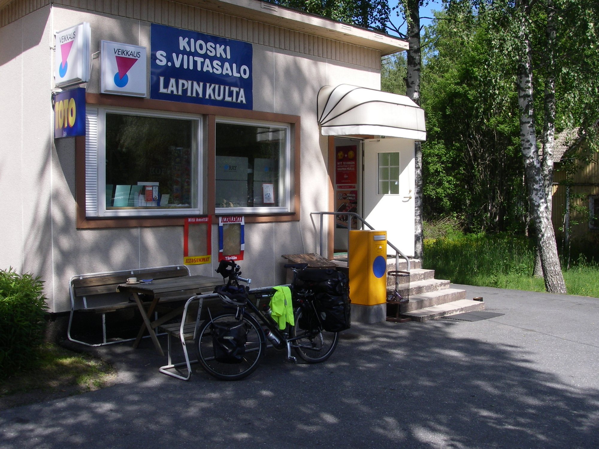 Kun pääsin tien 23 risteykseen huolestuin raskaan liikenteen määrästä. Rekkoja meni kumpaankin suuntaan. Onneksi Kihniöön on vain 15km, kyllä sen kestää. Kihniössä pysähdyin kahville paikalliselle elintarvikekioskille. Pulla ja kahvi maksoi euron, etelässä sillä ei saaedes kahvia.