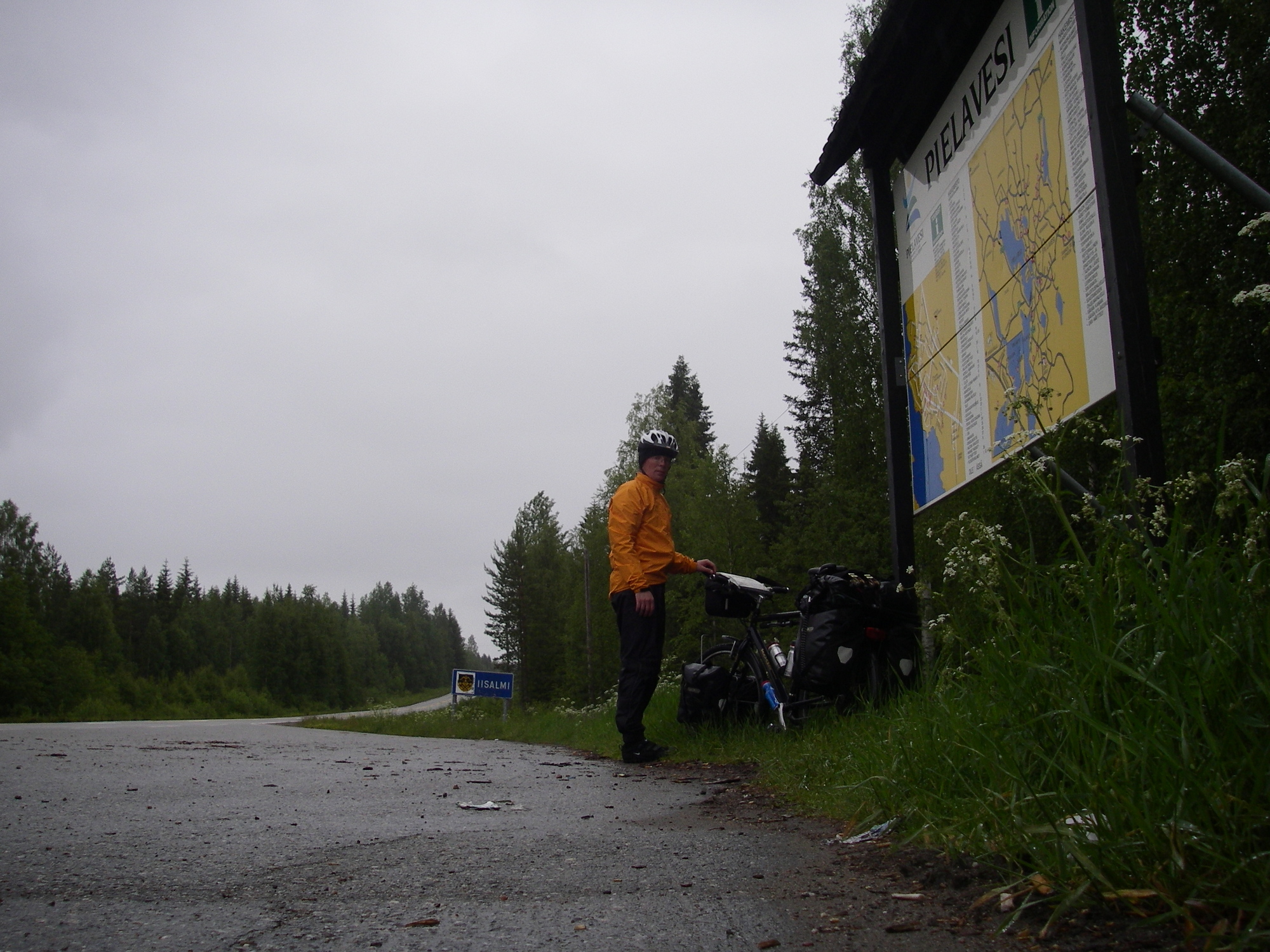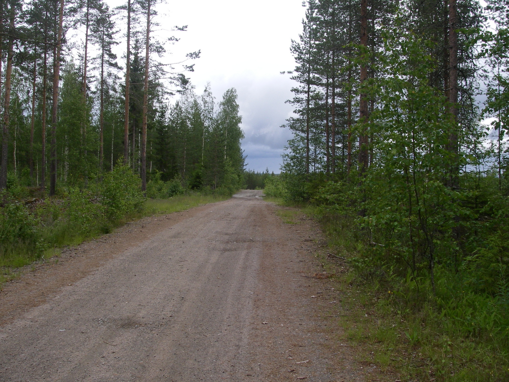 Keiteleeltä lähtiessä alkoi taas satamaan, sitä ei kestänyt pitkään. Sen jälkeen sateet väistyivät ja taivaskin hieman sinersi. Uusia kuuroja alkoi taas ropisemaan niskaan. Tuuli oli onneksi selän takana pahimpien kuurojen ajan. Vähän ennen Pielaveden liittymää huomasin pienen metsätien menevän tien suuntaisesti. Kartan mukaan sitä pitkin pääsisi Pielaveden risteykseen. Lähdin kokeilemaan sitä. Oli mukava ajella keskellä metsää. Liikenne oli vähitellen lisääntynyt tiellä 77.