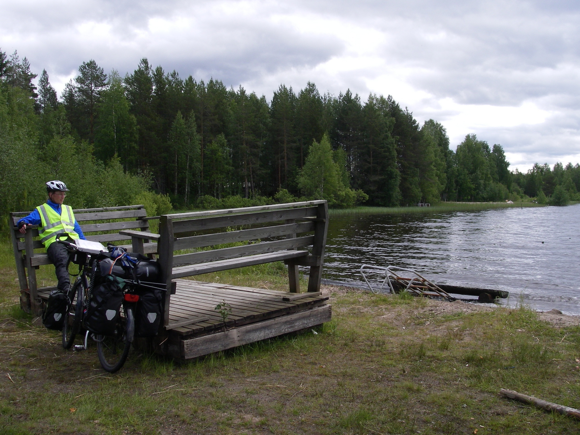 Päivä alkoi kauniilla auringon paisteella, tuuli oli kohtalainen.Pakkasin tavarat ripeästi jotta pääsisin äkkiä liikkeelle. Leirintäalueen omistaja kuitenkin huhuili käymään kahvilassa. Hän tarjosi kahvit ja munkin, oli ilmeisesti vailla juttu seuraa. Siinä sitten juteltiin niitä näitä jonkun aikaa.