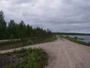 Leirintäalueella puurot ja kahvit ennen lähtöä. Nyt alkaa asutus ja palvelut harvenemaan. Pirttikoskelle on 70 km ja ennen sitä ei ehkä ole mitään palveluita. Matka lähti etenemään helpon tuntuisesti. Ilma oli pilvinen ja tyyni. Sateita oli näkyvissä joka puolella, päätin vaihtaa sadetakin päälle kun pysähdyin. Mäkärät olivat nyt todellinen ongelma, niitä oli isoja pilviä ympärilläni …