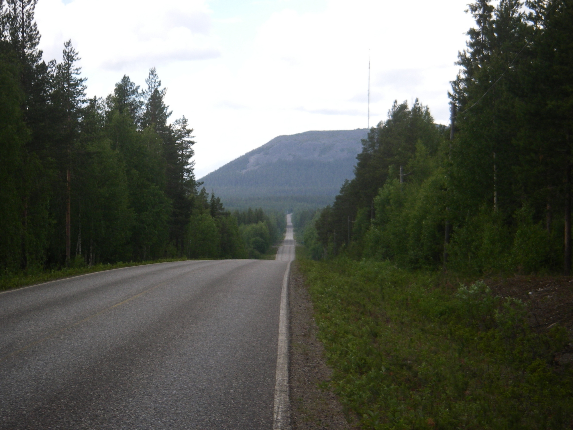 Pyhätunurin masto näkyi pitkälle. Tie nousi ja laski ennen kuin pääsin sinne asti. Kävin niin ylhäällä tunturissa kuin tietä pitkinpääsi. Sieltä olisi päässyt oikaisemaan takaisin tielle 962 mutta jyrkkä alamäki oli hiekkatietä. Se olisi ollut liian vaikea painavalle pyörälle. Pyhätunturin ja Luoston välillä oli valtavia paarmoja. Ne pörräsivät ylämäessä ymäprillä ja välillä lensivät suoraan päin. Niistä ei muuta haittaa ollut, aloin jo tottua niihin. Joillekin ne olisivat hyvä kirittäjä ylämäessä.