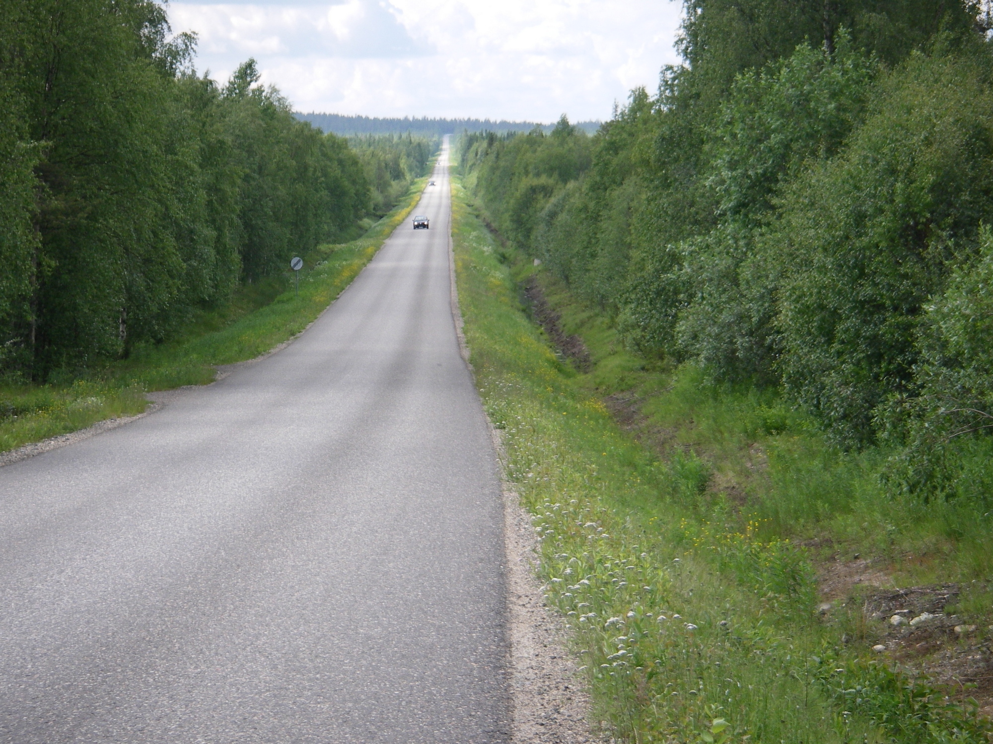 Maisemat olivat mukavat, tie nousi ylös ja alas tieheästi. Aina välillä oli suo ja tasaista. Aina kun nousin vähän aikaa ylämäkeä se tiesi mahtavaa näköalaa ylhäällä. Ilma oli lämmin, ukkoskuuroja meni välillä yli viilentäen mukavasti. Välillä aurinko paistoi ja satoisamaan aikaan.