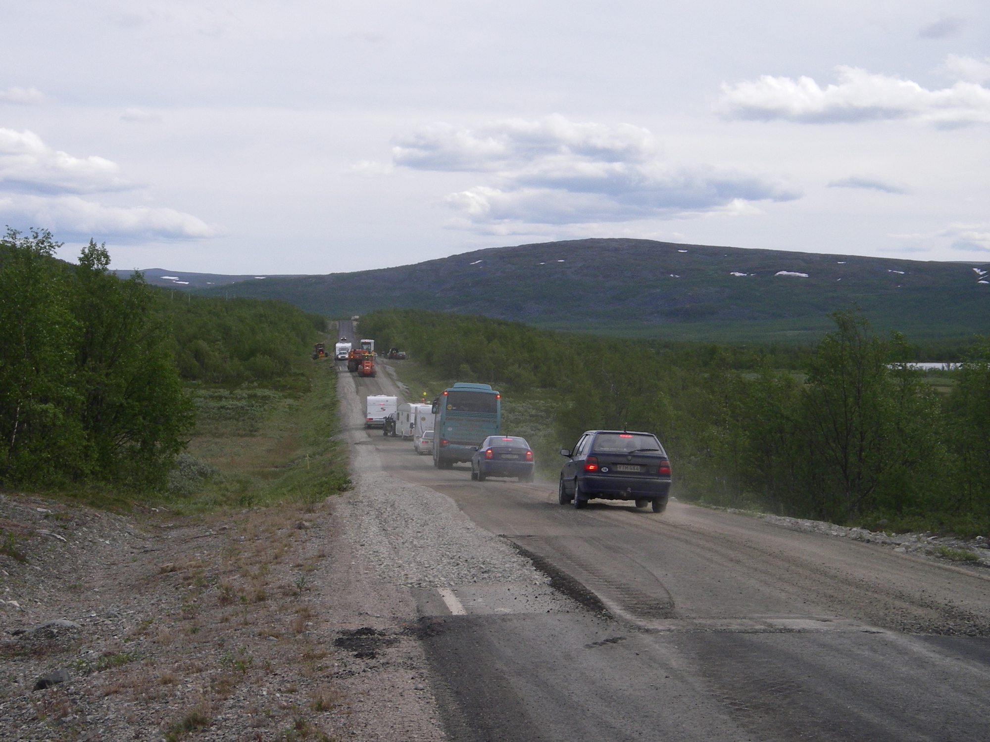 Nyt koivutkin hävisivät maisemasta, tuntureita on enemmän ja välissä suota. Välillä näkee melkein 10 kilometrä tietä eteen jos ei ole paljon mutkia. Tuuli on ollut kova koko päivän, se puhaltaa vielä lännestä.Välillä se on suoraan sivulta ja välillä on melkein vastatuulta. Sivulta se häiritsee enemmän ajamista, silloin en pysty juomaan vauhdissa mikä hidastaa aika paljon vauhtia.Tietyöt ovat myös hidastaneet hieman.Välillä päälystettä ei ole ollenkaan. Koneita on paljon tiellä ja useinon käytössä vain yksi kaista. Hienot maisemat saavat olosuhteet unohtumaan.