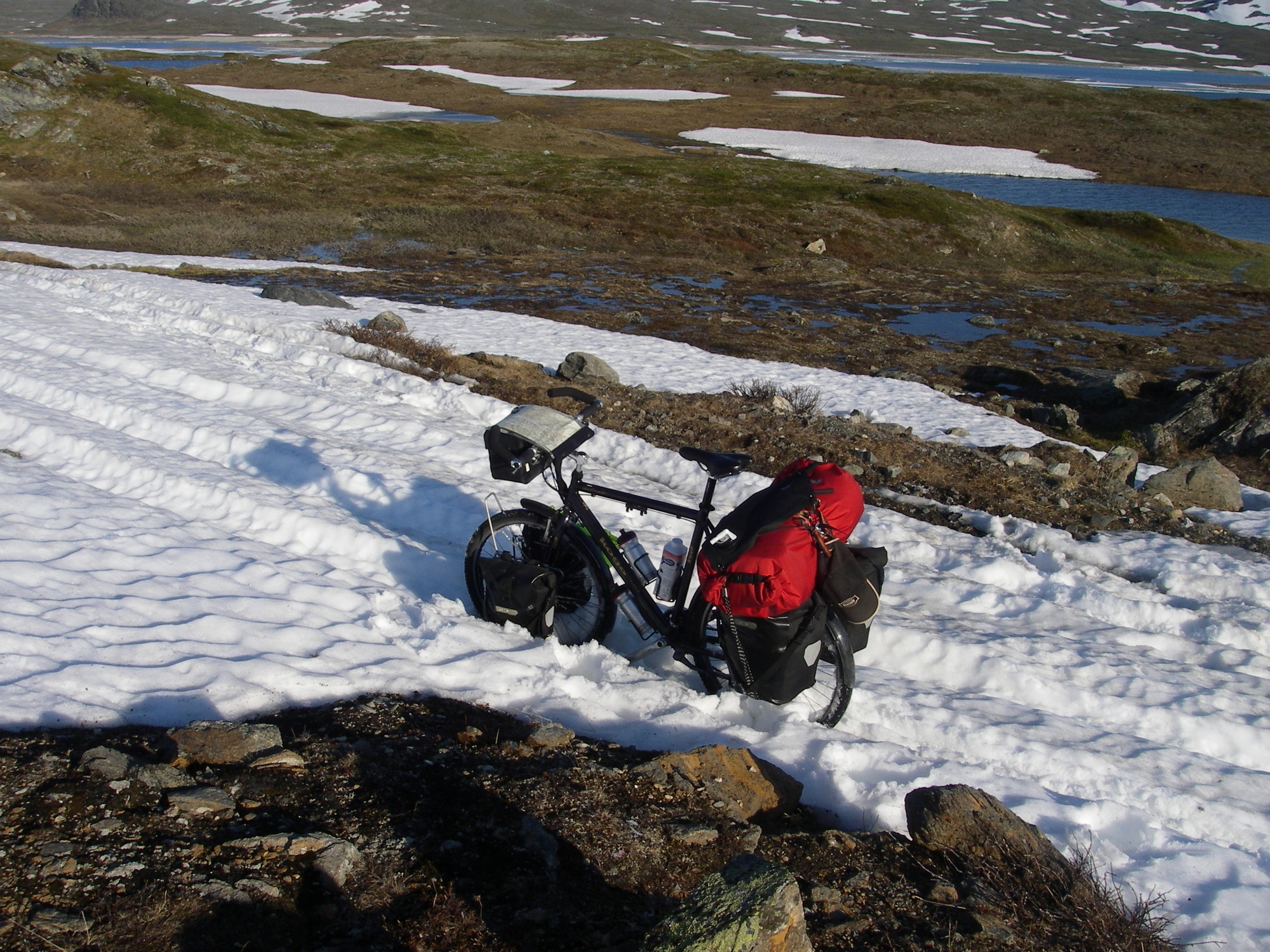 Kun mäki alkoi sen huomasi, mutkia oli paljon ja välillä mentiin tulosuuntaan. Välillä vesi oli huuhtonut kaiken hiekan tieltä, jäjlellä oli vain kivikkoa. Yritin ajaa niiden kohtien läpi väkisin mutta kun kaaduin ensimmäisen kerran päätin taluttaa loput vaikeat kohdat. Tie oli kapea ja toisella puolella aina jyrkkänne, aitaakaan ei joka paikassa ollut joten piti olla varovainen. Mäki tuntui vain jatkuvan kunnes yllättäen tuli risteys, toinen tie oli suljettu portilla, toiseen suuntaan oli laitettu kyltti, ”HALTI 6 km”. Olin jo melkein perillä.Nousua ei enään ollut joten ajattelin lopun sujuvan helposti. Tiehuononi edelleen, jouduin taluttamaan pyörää melkein koko matkan järven itäpuolelle. Tie oli poikki yhdestä kohtaa, siinä oli noin metri lunta.Sain pyörän kuitenkin siitä raahattua yli, laukut toimivat suksina joten se ei uponnut kovin syvälle.