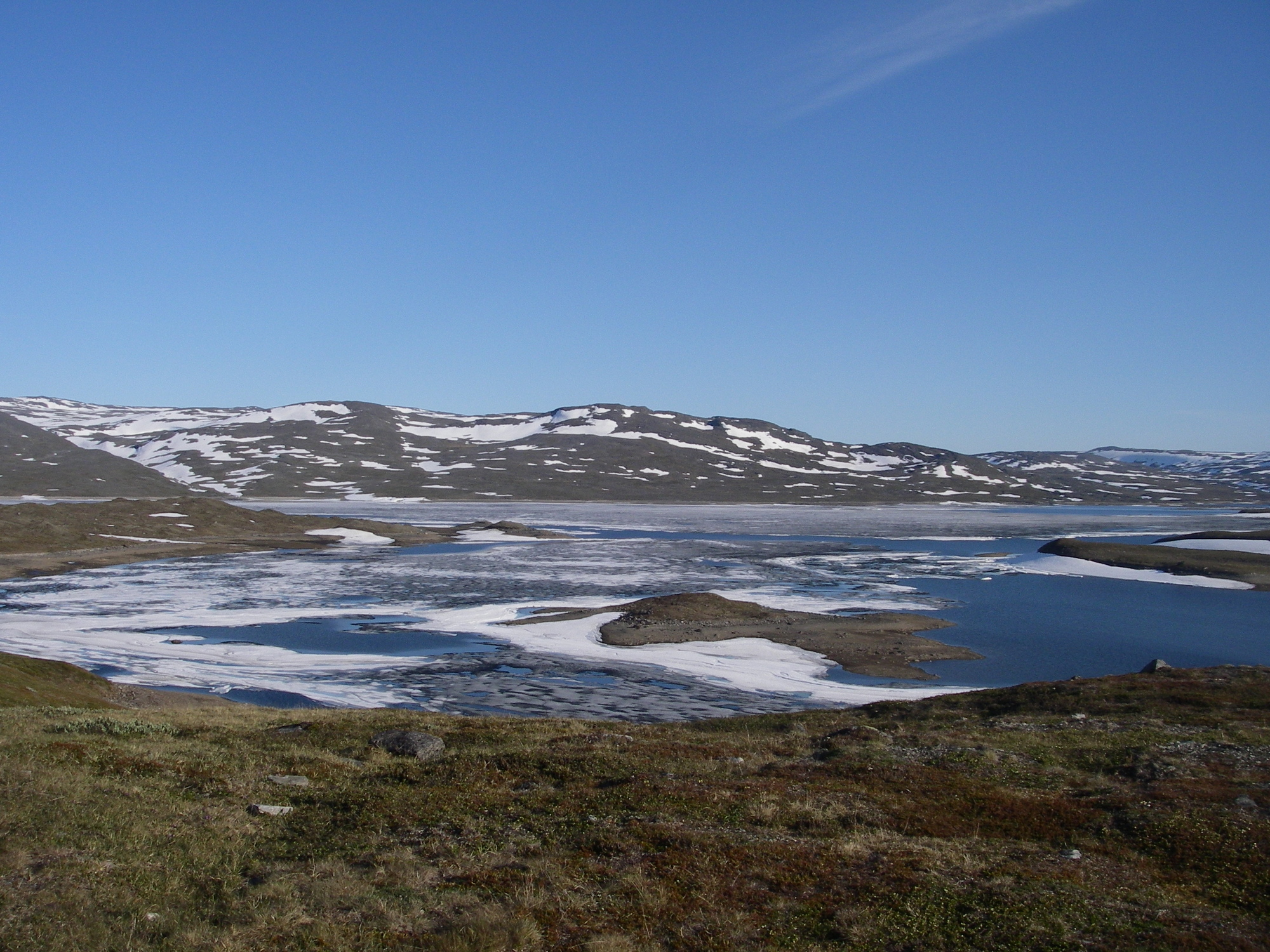Näkymät olivat huikeat, järveä ympäroi lumihuippuiset tunturit. Järvi oli vielä osittain jään peitossa. Jo näiden maisemien vuoksi kannatti polkea tänne ylös.