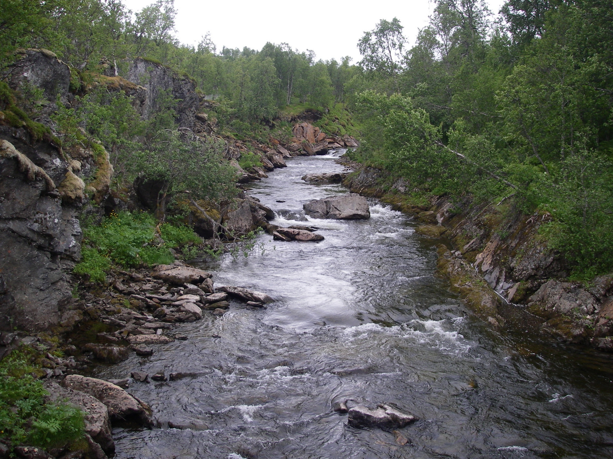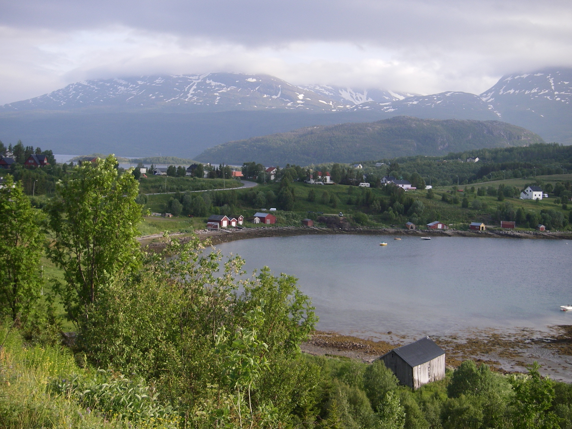Lähdin Finnsesnistä pikkutietä ”esikaupungin” läpi. Talot ovat hieman erillaisa ulkoa kuin suomessa, sisältä olisi mielenkiintoista nähdä onko niissä saunaa. Matka jatkui vuonon rantaa, sumu peitti välillä kaiken näkyvyyden joten maisemia pystyi ihailemaan vain toisinaan. Päätin ajaa laaksojen läpi Sjöveganiin, siellä voisi olla vähemmän sumua. Kun käännyin laaksoon myötätuuli auttoi ylösmenossa eikä mäkeä edes huomannut. Koski tien vierellä oli 13 kilometriä pitkä. Mäkeä jatkui noin 20 km ja ylhäällä oli järvi. Jäin levähdys paikalle järven rantaan syömään peinen eenergia latauksen, kuivattua poroa ja paikallista rieskaa.