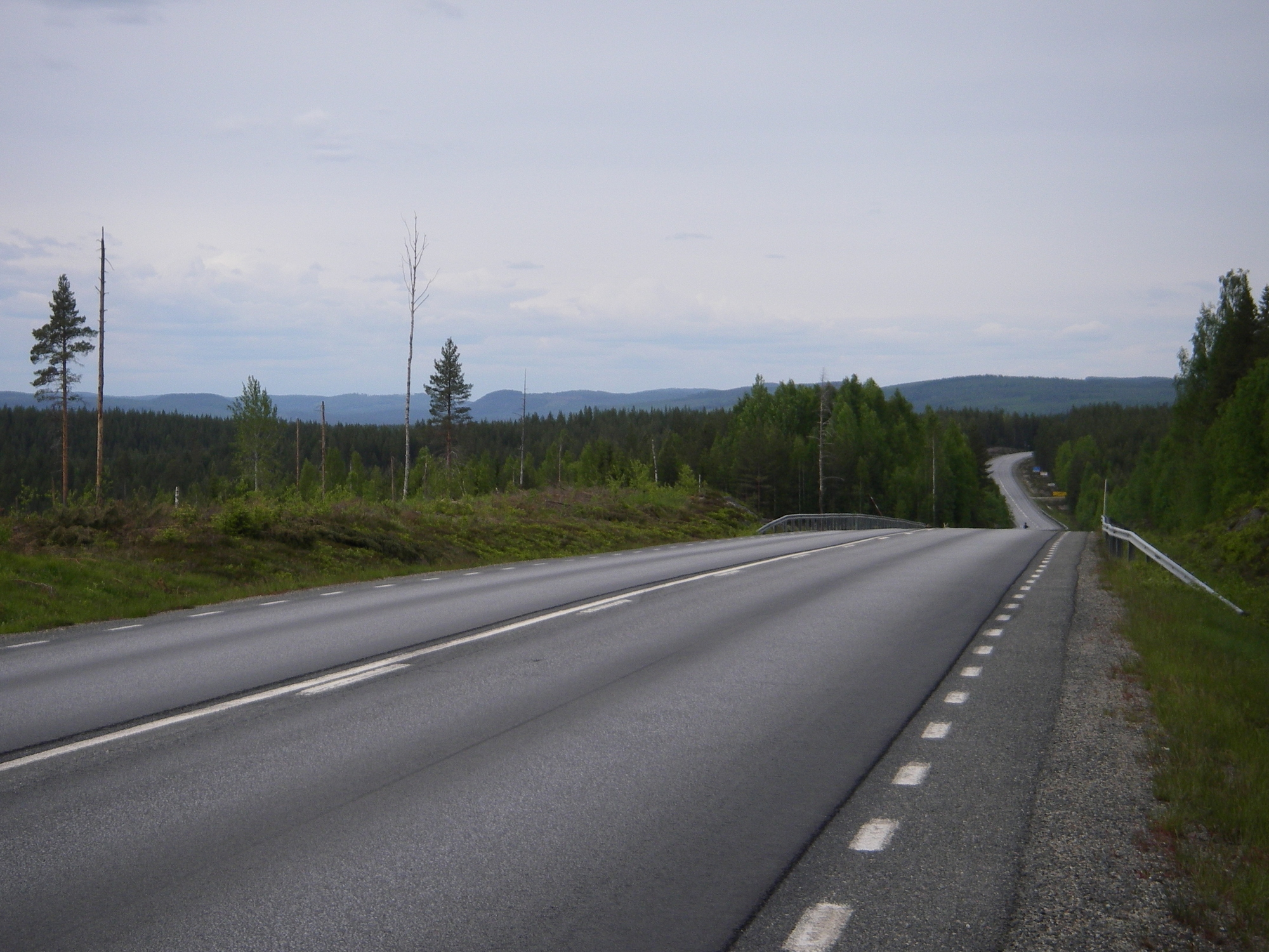 Suunnistaessani pois Umeåsta huomasin pienen hiekkatien kulkevan samansuuntaisesti. Se tuntui hyvältä ajatukselta silloin. Tie kävi aina välillä pidemmällä metsässä mutta kiesi aina takaisin isomman tien vierelle, sinne ei kuitenkaan päässyt mistään. Seuraavaksi tie kiemurteli taas kauemmaksi. Sitten alkoi tulla eteen kaikenlaisia kylttejä, niissä oli jotain juttua sotilasalueesta. Sitten tuli jo selkeä kielto edetä pidemmälle. Päätin kääntyä takaisn. Siitä tuli yli 20 kilometriä enemmän matkaa.