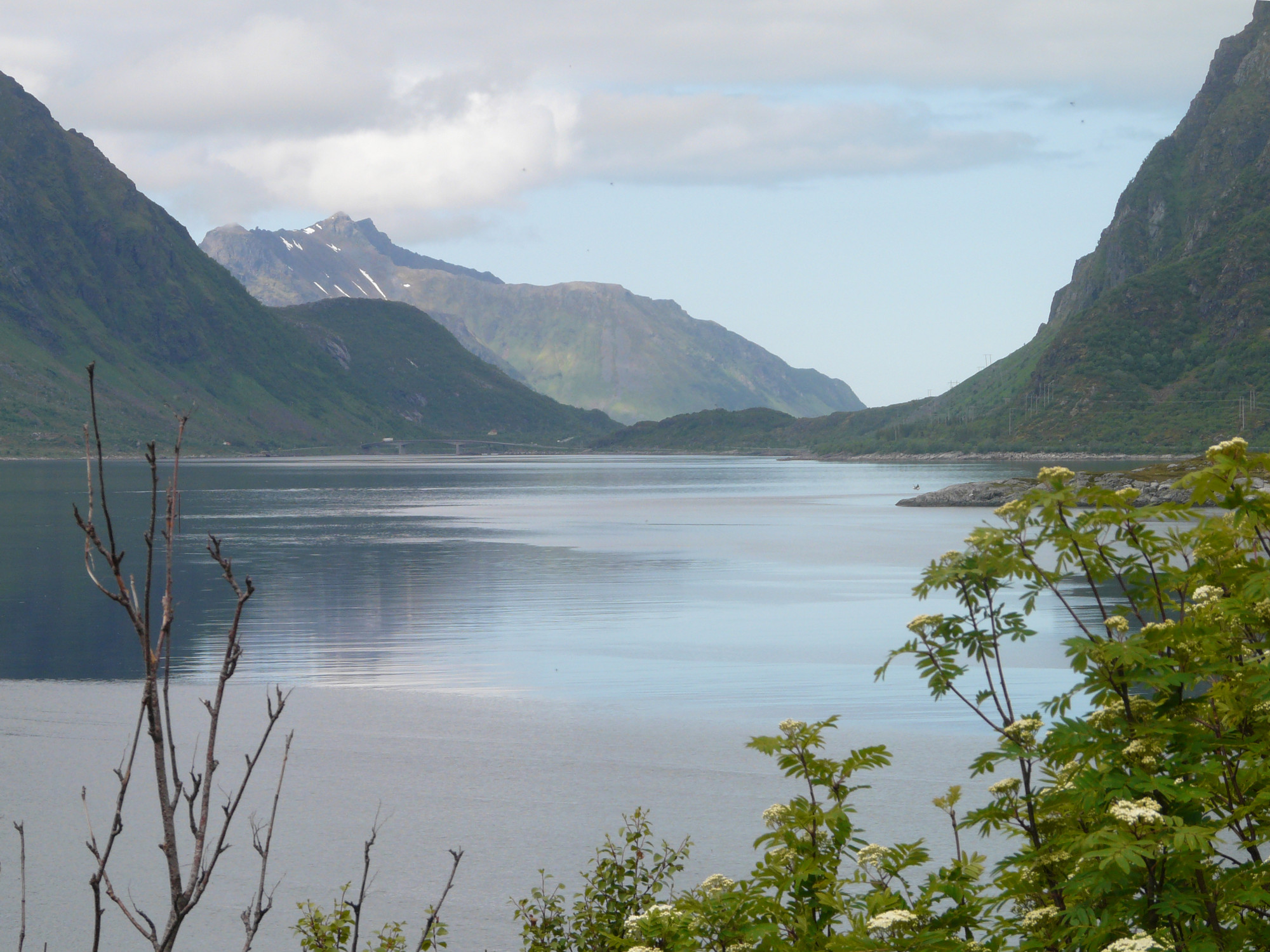 Aurinko paistoi kauniisti ja tuuli tyyntynyt lähtiessäni. Ihan kuin olisi siirtynyt hetkessä tuhat kilometriä etelämpään. Eteneminen oli hidasta, koko ajan piti yrittää kuvata vuonoja ja vuoria. Korppeja oli usein raakkumassa korkeilla kallioilla. Yritin niitä kuvata aina välillä huonolla menestyksellä. Merikotkia näkyi yllättävän usein. Tie kulki lähellä merenrantaa joten suuria mäkiä ei ollut.