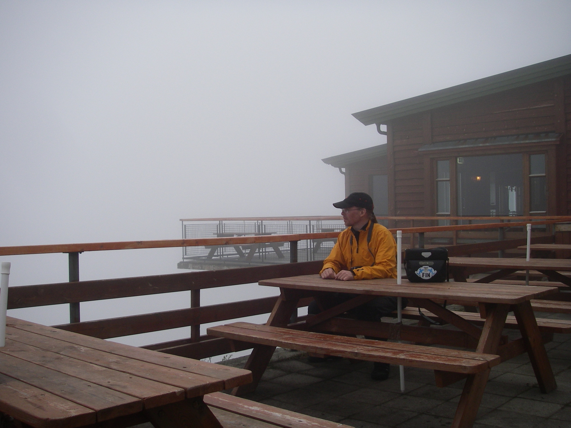 Otin mökin leirintäalueelta ja suoritin pakolliset ostokset. Suuntasin köysiradalle hienojen maisemien toivossa. Pilvet tekivät maisemien ihailusta mahdotonta. Vuoren huippua ei näkynyt ollenkaan alhaalta. Menin kuitenkin ylös, olisihan jännittävää mennä pilven sisään. Joitain maisemakuvia ehdin ottaa ennenkuin näkyvyys hävisi.