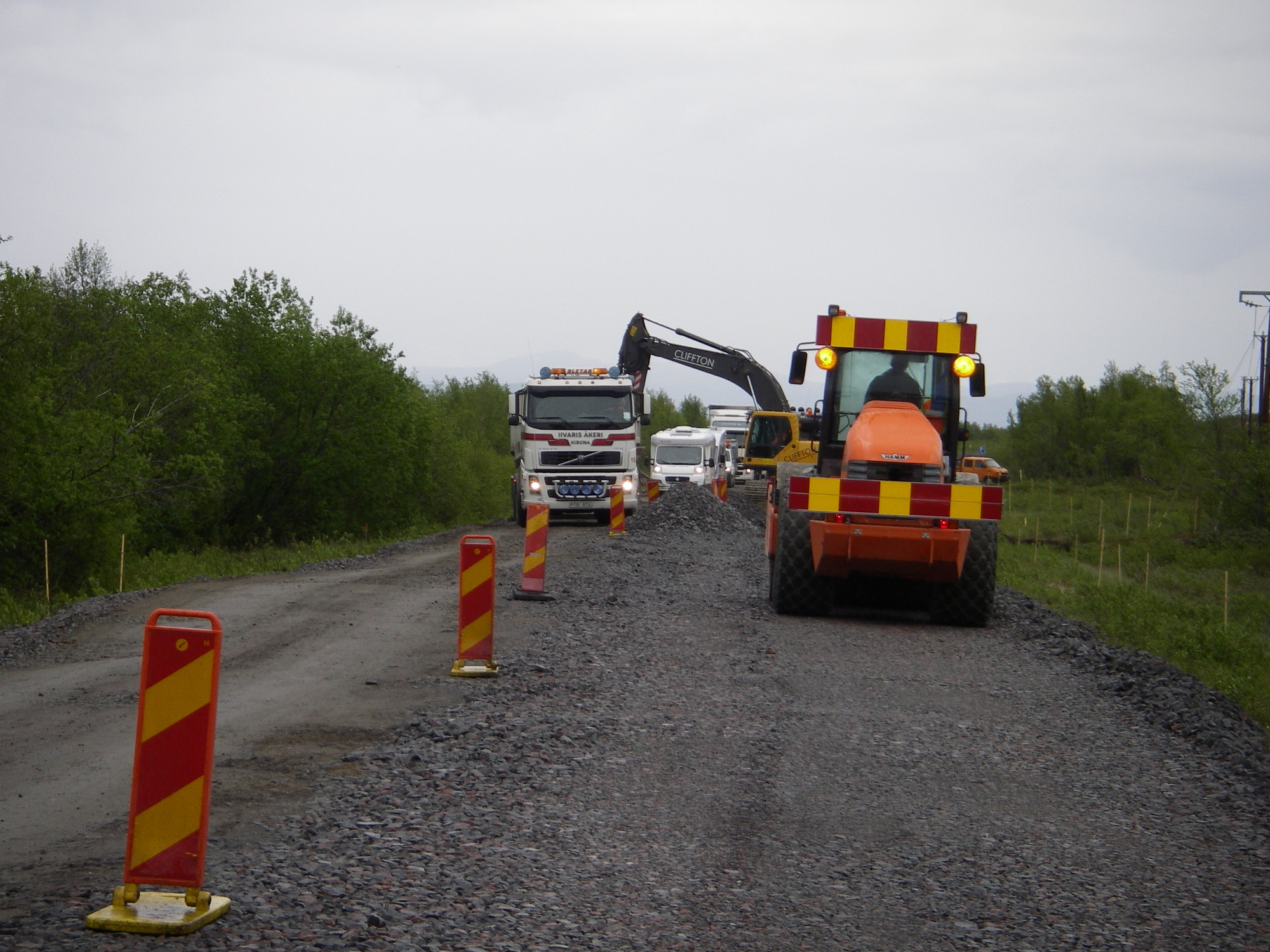 Tapasin skotit tiellä heti kun lähdin jatkamaan matkaa. Kuvasimme toisiamme vauhdissa. Ajoimme yhdessä jonkun matkaa kunnes päätin jatkaa omaa tahtia. Matkan ensimmäinen rengasrikko tuli eteen seuraavaksi. Tutkiessani syytä siihen meinasin masentua, ulkorengas oli revennyt. Nyt piti käyttää mielikuvitusta. Kirunaan olisi noin 50 km, pitäisi saada rengas siihen kuntoon että pääsisin sinne. Onneksi varustukseen kuuluu aina ilmastointiteippi, sillä sai nyttenkin ihmeitä aikaan. Rengas kesti lopun matkasta.