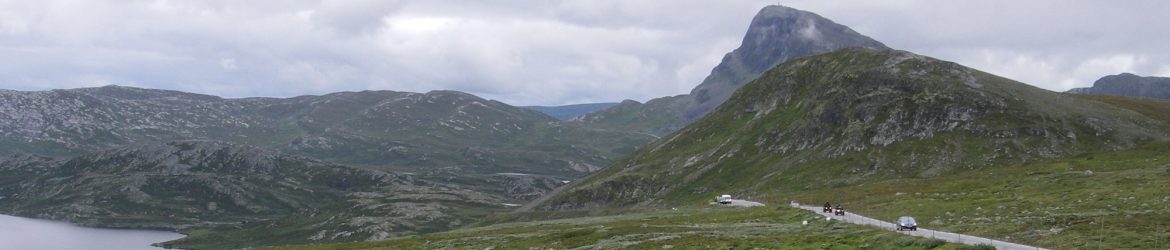 Ylämäki ensimmäiselle ylängölle alkoi Maurvangenista. Mäki oli juuri sopivan jyrkkä, siinä pysyi lämpimänä mutta ei tarvinnut pysähtyä tasaamaan sykettä. Maisema oli kaunista tunturi maisemaa, järviä ja pieniä jokia oli joka puolella. Pilvet alkoivat peittää näkyvyyttä tien noustessa korkeammalle. Pilvissä tiheä tihkusade viilensi mukavasti. Pysähdyin kahville hotellissa tien korkeimmalla kohdalla, 1389 metriä.