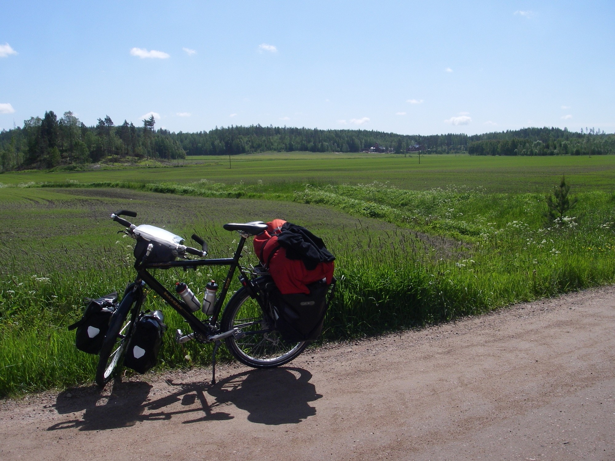 Lähdin aamulla ruuhkan aikaan polkemaan Helsingin läpi, se oli aika stressaavaa. Painavalla ja kömpelöllä pyörällä meinasi jäädä jalkoihin. Matka läpi Helsingin kesti yli tunnin. Sen jälkeen pystyin ihailemaan maisemia hienossa säässä. Tuuli oli myötäinen ja aika kova, se kevensi etenemistä mukavasti.