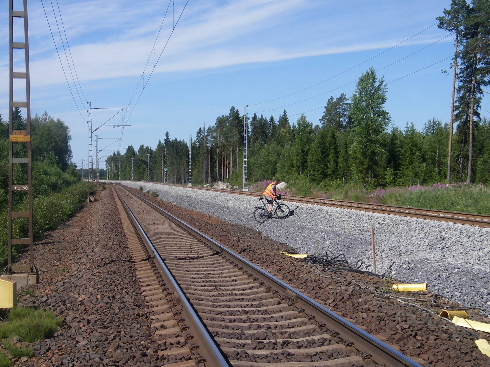 Yhdessä kohtaa suuri johtajamme herra Larimo johdatti meidät tielle (yllätys, soratie), joka päättyi suljettuun tasoristeykseen. Siitä näki yhden toimivan ja yhden rakenteilla olevan kiskoparin yli sen tien, minne yritimme mennä. Ei auttanut muu kuin kantaa kamat ratojen yli kuikuillen samalla junaa ja lopuksi tietenkin fillari kainaloon myös. Oli taatusti vaikein radan ylitys, jonka olen koskaan suorittanut. Lämpötilakin oli jotakuinkin 27 astetta varjossa ja siinä oli täysi auringonpaiste mustalle kivimurskalle, joten ei päässyt meille kylmä tulemaan.