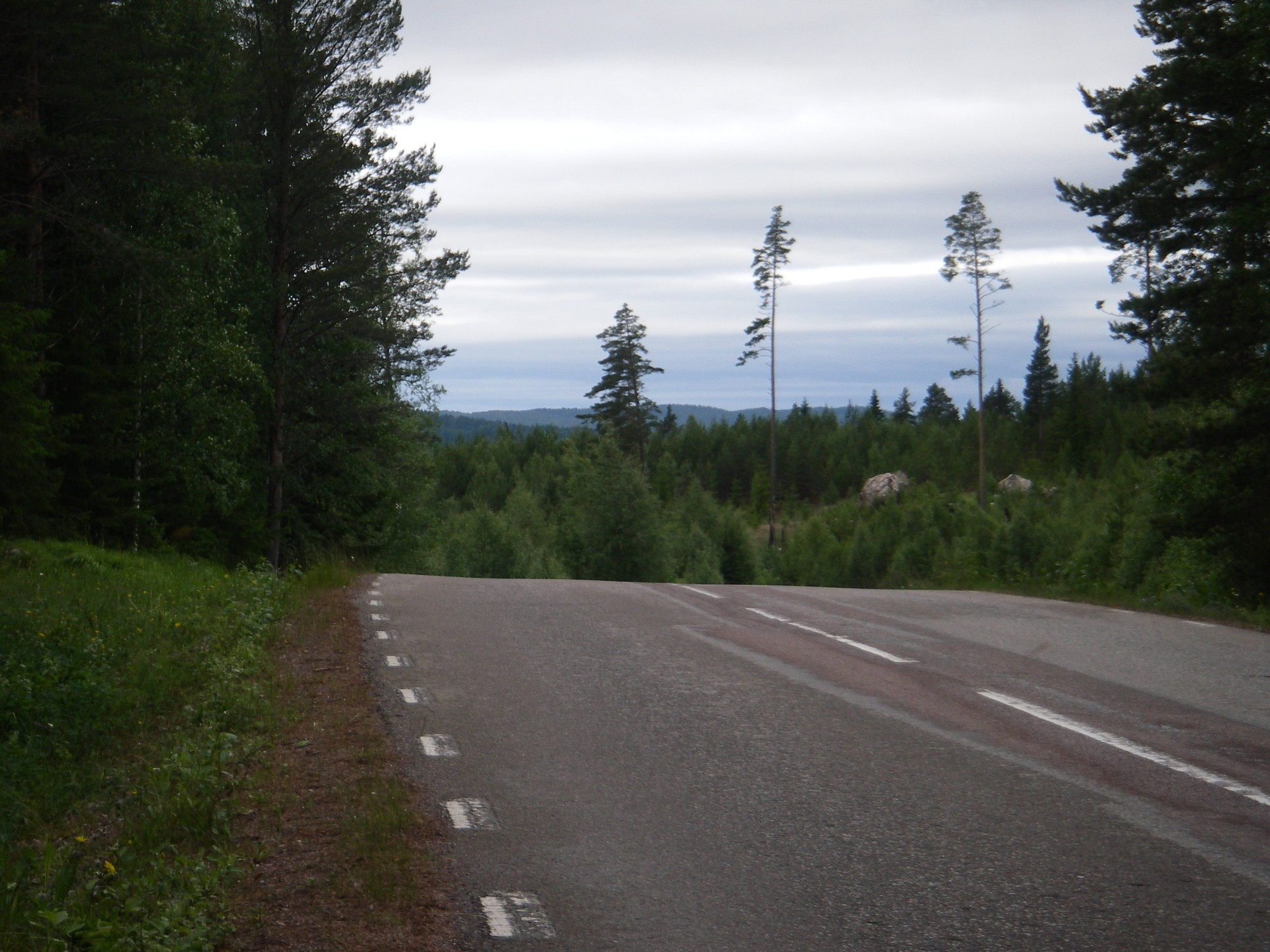 Mäkiä on huomattavasti enemmän kuin aikaisempina päivinä. Ne ovat pidempiä mutta eivät ole kovin jyrkkiä. Vilkkaasta liikenteestä ei ollut haittaa koska Falunista oli pyörätietä 5 km. Sen jälkeen käännyin pienemmälle tielle jolla ei liikennettä ollut. Samalla maisemat paranivat. Tie kierteli pieniä järviä joita renusti kesämökit. Kilpapyöriä tuli vastaan useasti, tämä on suosittu pyöräilykohde.