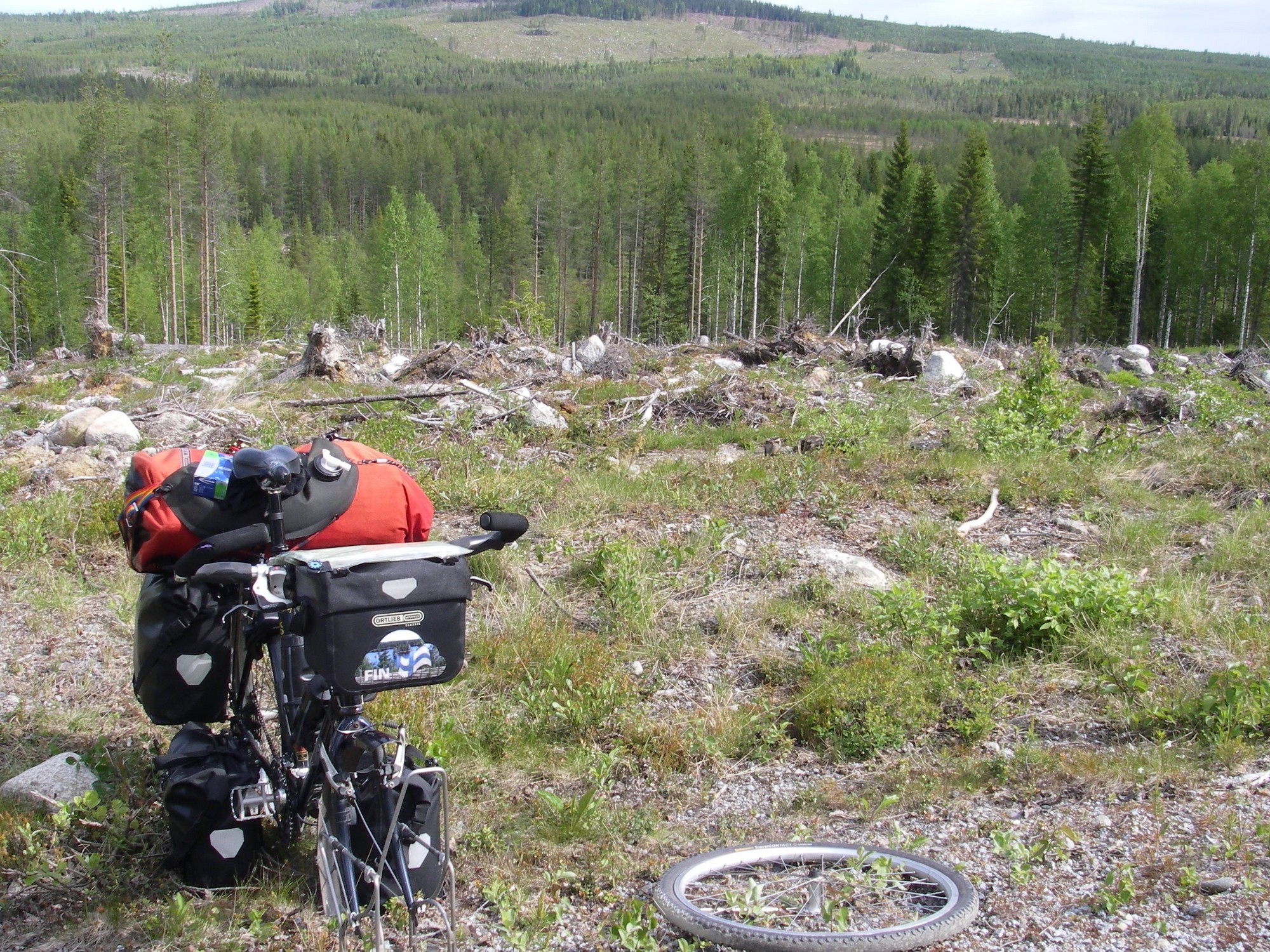 Hiekkatie alkoi kivalla ylämäellä. Se oli oikea maisema reitti, rinne oli niin jyrkkä että puut eivät tulleet pahasti näköalan eteen. Kolmannella tunturin ylityksellä aloin miettimään että jos mennään näin nopeasti ylös ja alas niin päivästä saattaa tulla aika rankka. Rengasrikko vielä hidasti matkaa entisestään, onneksi kumi tyhjeni mäen päällä niin sain sitä vaihtaessa ihailla hienoa maisemaa. Kettu kävi tarkistamassa mitä puuhailin, se ihmettelin jonkun aikaa puuhiani ja katosi metsään.