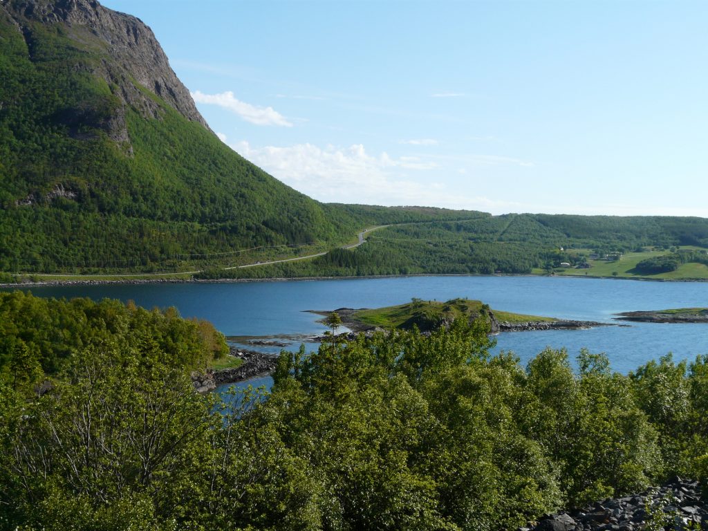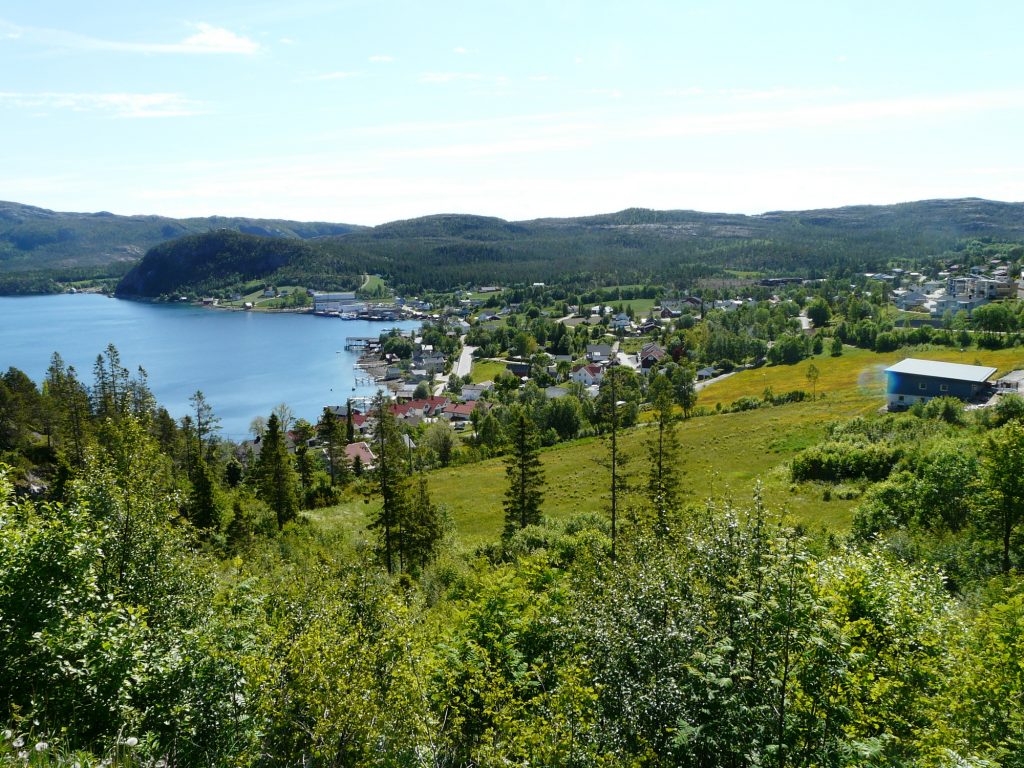 Maisemat olivat edelleen silmää hiveleviä. Ylämäkeen poljin aina innokaasti koska useimmiten mäen päällä odotti loistava maisema. Naustbuktan kylässä kävin kaupassa ostamassa kinkkua leivän päälle. Jäin kaupan eteen syömään leipää mutta en jaksanut alkaa kahvin keittoon. Yllättäen kaupan myyjä tuli ulos kahvipannun kanssa ja kysyi haluaisinko kahvia, se kruunasi välipalan.