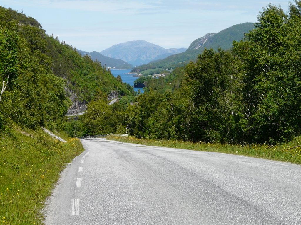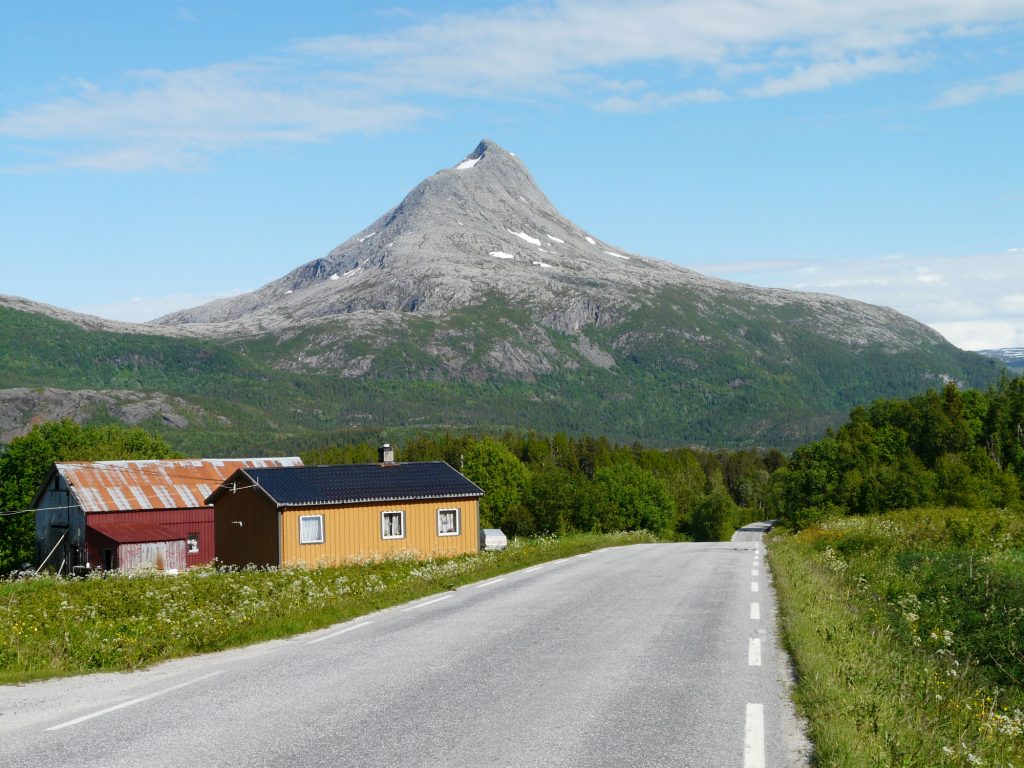 Kun pääsin tielle 17 maisemaa hallitsi Heilhornet, 1058 metriä korkea vuori meren rannassa. Se on suosittu vaelluskohde, huipulle menee merkitty reitti. Sen mahtavuutta jäin ihmettelmään useasti tien varteen. Tie 17 kurvasi peinen matkaa Heilhornetin rinnettä ylös.