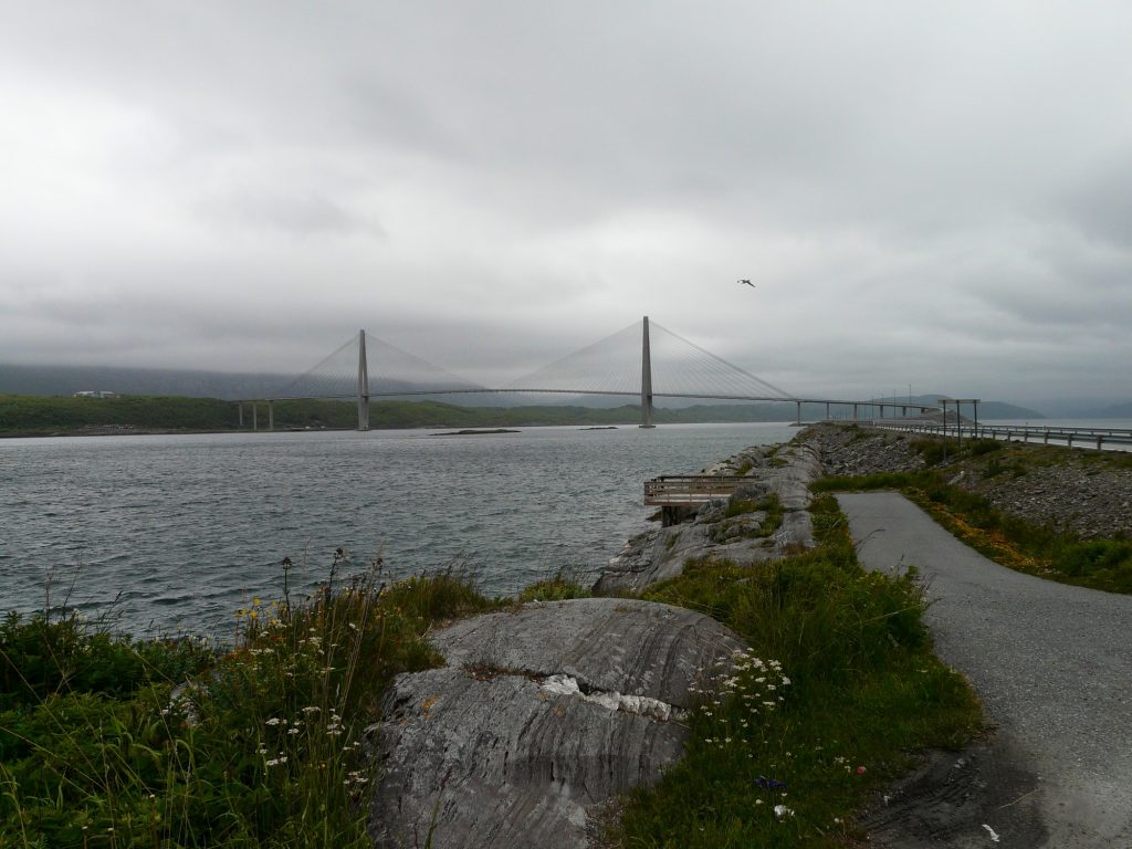 Heti kaupungin ulkopuolella oli valtava silta, Helgelanbrua. Ennen siltaa oli ppaljon kaikenlaisia varoituksia ja opasteita turvalliseen ylittämiseen. Eniten minua kiinnosti tuulen voimakkuus, se oli 9 m/s. Onneksi tuuli olisi vastainen se ainoastaan hidastaa menoa. Luulin lossin lähtevän 13:55 Levangin laiturilta joten en pitänyt mitään kiirettä. Pienessä kylässä oli kauppa ja kahvila, tein jotain ostoksia ja menin kahville. Samalla katsoin uudelleen lossin aikataulua eri paikasta. Siinä oli ihan eri aikoja ja päivämäärät täsmäsivät. Minulla oli tunti aikaa ajaa 16 km, tuuli oli vastainen ja matkalla oli muutama pitkä ja jyrkkä mäki. Lähdin kuitenkin yrittämään, sillä saisin pari tuntia lyhennettyä matkaan menevää aikaa. Olin lopulta 15 minuuttia ennen lossin lähtöä perillä, juuri kun pääsin rantaan he alkoivat ottaa matkustajia kyytiin.