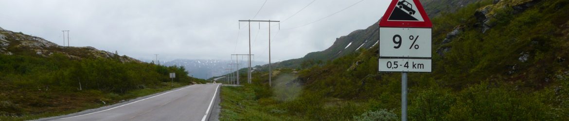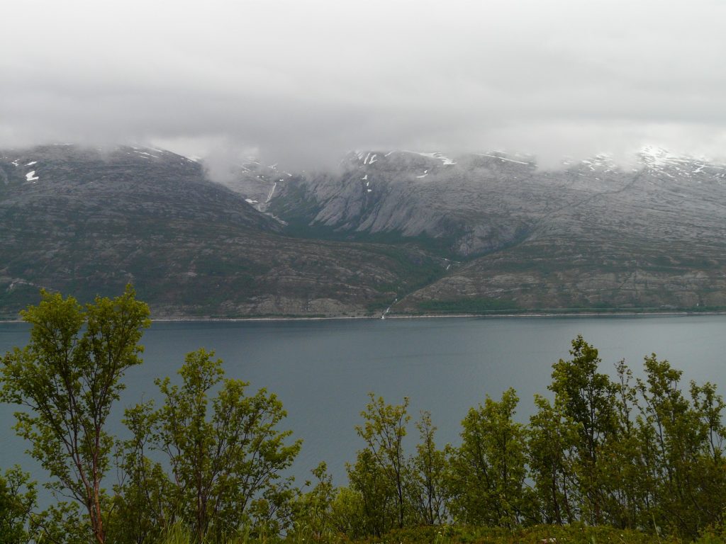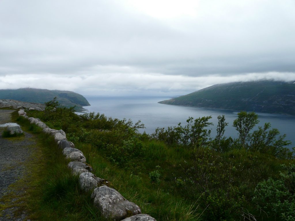Sitten tuli kyltti 14 kilometrin ylämäestä, se oli yllätys. Vähensin vaatetta ja lähdin kiipeämään mäkeä ylös. Vuonon ranta oli edelleen aika lähellä mutta koka ajan alempana. Korkeimmalla kohdalla oli levähdys paikka jossa kävin ottamassa muutaman kuvan. Maisema oli pilvistä huolimatta hieno. Alamäkeä oli noin 10 kilometriä, tie oli useimmiten suora ja tuuli tyyni niin pystyin laskemaan sitä alas jarruttelematta. Yksi tunnelikin siinä oli, mutta se oli vain 500 metriä pitkä.