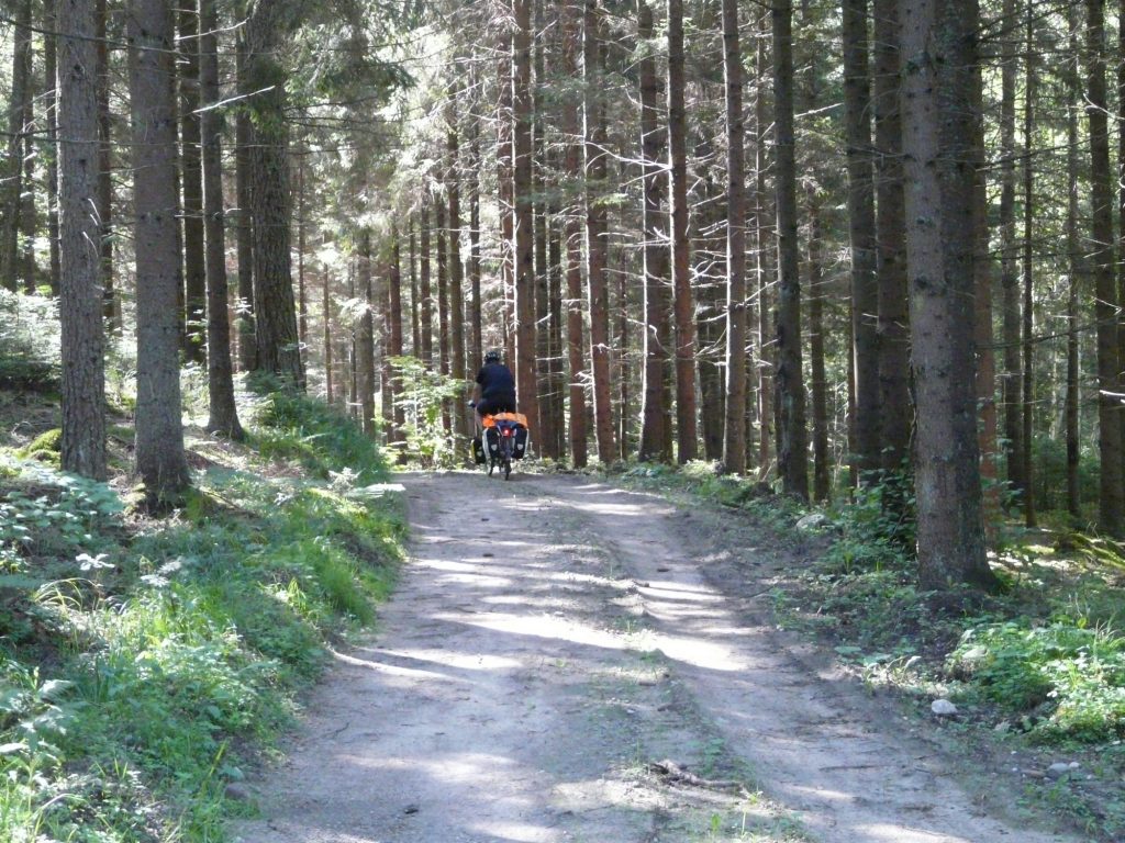 Suunnitelma oli ajaa sekaisin isoa tietä ja Green Velo reittiä. Ensimmäinen rekka joka ajoi ohi sai meidät menemään metsätielle Venäjän rajan lähellä. Suunnistaminen oli välillä hankalaa, pieniä metsäteitä risteili joka suuntaan. Kännykkä löysi vain Venäjän verkon joten Googlekaan ei paljoa auttanut. Onnistuimme kuitenikin suunnistamaan oikealle tielle, välillä kyllä luulin että eksyimme sinne metsään.