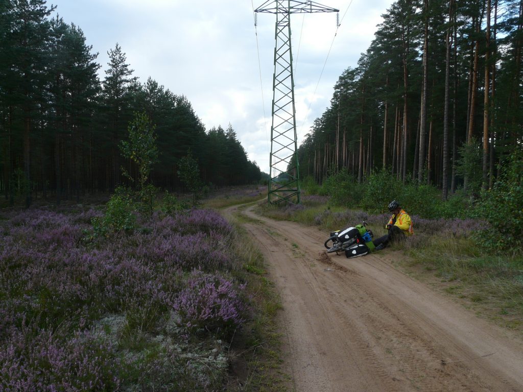 Käännyimme noin 10 km ennen Tomea vieä pienemmälle hiekkatielle, se oli ihan hyvässä kunnossa. Kaikenalaisia varoitusmerkkejä ja kieltoja oli paljon. Vielä noin 5 km ennen majapaikkaa päätimme oikaista juuri auton mentävää metsätietä. Ajourat olivat välillä vaikeasti ajettavaa pehmeää hiekkaa. Metsä oli täynnä kauniin väristä kanervaa. Antero tutustui kanervikkoon vieläkin tarkemmin, han kaatui pehmeässä hiekassa ja laskeutui keskelle kanervikkoa. Siinä pahimman vaurion siinä kärsi iso ego.