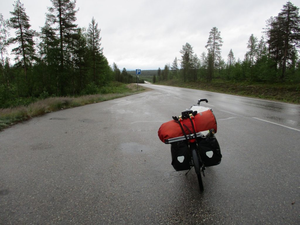 Sade alkoi melkein heti kun lähdin muoniosta. Onneksi vastainen tuuli ei ollut kovin kova, muuten olisin ollut aika märkä. Mäet olivat edelleen pitkiä ja loivia, vastatuuleen ylämäet olivat välillä aika raskaita. Välillä sade yltyi niin kovaksi että oli vaikea nähdä mitään.
